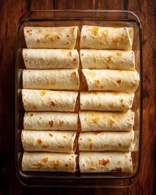Arrange the rolled tortillas seam-side down in a baking dish, fitting them snugly together. Lightly brush the tops with olive oil for extra crispiness.