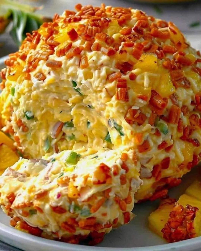 Introduction This dish is a classic Pineapple Cheese Ball, a sweet and savory appetizer that combines creamy cheese, juicy pineapple, crunchy nuts, and smoky bacon into one impressive centerpiece, often served at holidays, family gatherings, and celebrations because it is easy to prepare, visually attractive, and loved by many tastes. Ingredients You will need 16 oz cream cheese softened, 1 cup crushed pineapple very well drained, 1 cup shredded cheddar cheese, 1/2 cup finely chopped green onions, 1/2 teaspoon salt, 1/4 teaspoon black pepper, 1 teaspoon garlic powder optional, 1 cup finely chopped pecans or walnuts, 1 cup crispy cooked bacon bits, and crackers or fresh vegetables for serving. Instructions Begin by placing the softened cream cheese in a large bowl and beating until smooth and creamy, add the crushed pineapple making sure all excess juice is removed, then mix in shredded cheddar, green onions, salt, pepper, and garlic powder until evenly combined, shape the mixture into a ball or log using clean hands or plastic wrap, place chopped pecans and bacon bits on a flat plate, roll the cheese ball gently until fully coated, cover and refrigerate for at least 2 hours to allow flavors to set, then serve chilled with crackers or sliced vegetables. Methods This recipe uses a no-bake mixing and chilling method, allowing the cream cheese to bind the ingredients while refrigeration firms the structure, making it easy to slice or spread without losing shape. History Cheese balls became popular in mid-20th-century American entertaining, especially during holidays, as cream cheese became widely available, and variations with pineapple were introduced to balance richness with sweetness, creating a signature retro appetizer still loved today. Benefits This cheese ball provides protein and calcium from cheese, energy from nuts and pineapple, and satisfaction from its rich flavor, making it a filling appetizer that reduces the need for multiple dishes at gatherings. Formation The structure forms through softened cream cheese acting as the base binder, pineapple adds moisture and sweetness, cheddar enhances flavor depth, and the nut and bacon coating adds texture and contrast while sealing the outer layer. Lovers This dish is especially loved by party hosts, cheese lovers, fans of sweet-and-savory combinations, and families who enjoy nostalgic comfort foods served during celebrations. Nutrition An approximate serving contains 220 calories, 6g protein, 4g carbohydrates, 18g fat, and moderate sodium depending on cheese and bacon used. Conclusion This Pineapple Cheese Ball is a timeless, crowd-pleasing recipe that blends creamy, sweet, salty, and crunchy elements into one memorable appetizer, making it a reliable favorite for entertaining, celebrations, and shared moments around the table.