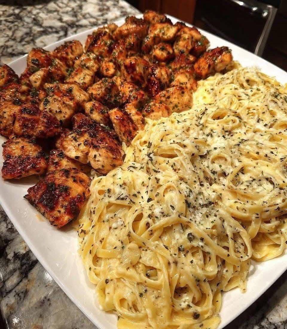 This mouthwatering dish features tender, seasoned blackened (or grilled) chicken bites piled alongside creamy, herb-sprinkled fettuccine Alfredo on a single plate. It’s a hearty Italian-American classic that combines smoky, spicy chicken with rich, velvety pasta for the ultimate comfort food experience. Perfect for family dinners or special occasions, this recipe serves 6 generously and captures the indulgent flavors of the dish.