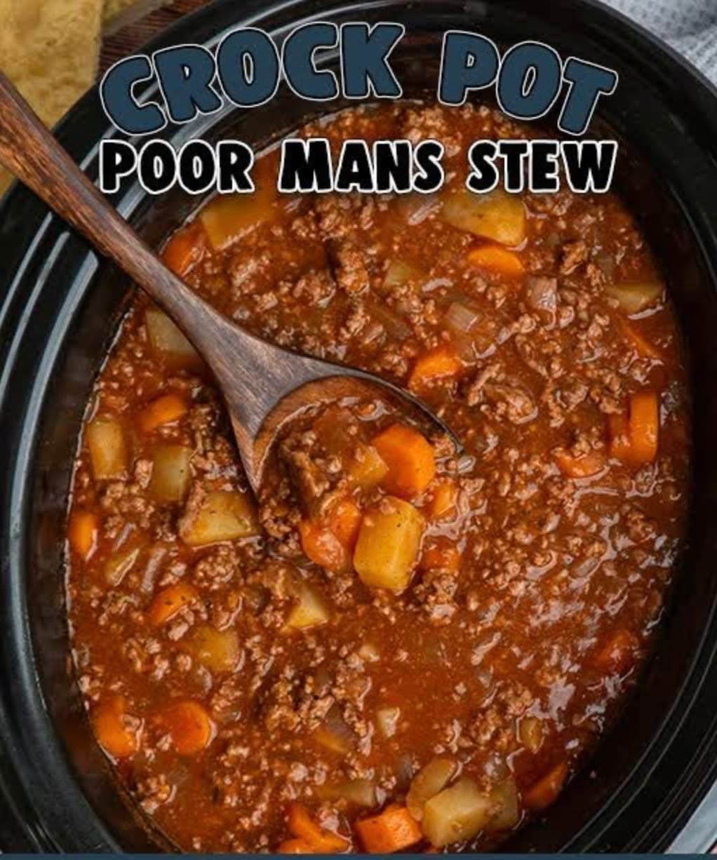 Crock Pot Poor Man’s Stew (also known as Hamburger Stew or Ground Beef Stew) is a hearty, budget-friendly comfort food classic that’s perfect for feeding a family without breaking the bank. This slow-cooked dish combines affordable ground beef with potatoes, carrots, onions, and a rich tomato-based gravy, resulting in tender, flavorful bites that warm you from the inside out. Your photo captures it perfectly—bubbling away in the slow cooker with that inviting wooden spoon ready for serving. It’s a set-it-and-forget-it meal ideal for busy days, cold weather, or anytime you need simple, satisfying nourishment. 0 “LARGE” 1 “LARGE” 2 “LARGE”