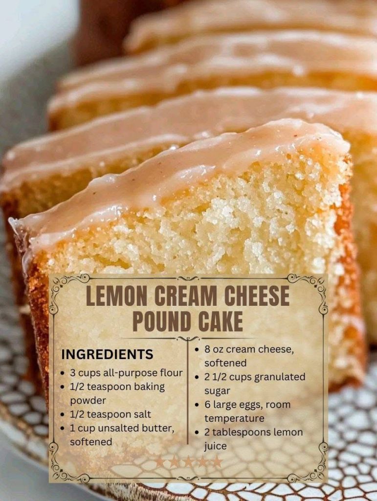 All-purpose flour gives structure and stability to the cake while maintaining a tender crumb. Baking powder adds a light lift without taking away from the dense pound cake character. Salt balances sweetness and enhances flavor. Unsalted butter provides richness and a smooth mouthfeel. Cream cheese adds moisture, tanginess, and a soft, creamy texture. Granulated sugar sweetens the cake and helps create a fine crumb when creamed properly. Eggs bind the ingredients and contribute to structure and richness. Fresh lemon juice brings brightness and acidity, while lemon zest intensifies the citrus flavor. Vanilla extract rounds out the flavors and adds warmth. Milk or sour cream may be added for extra moisture if desired.