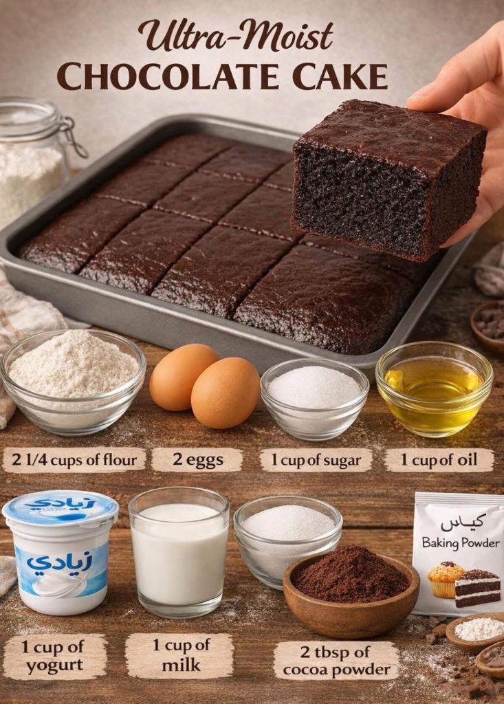 Ingredients: 2¼ cups all-purpose flour, 2 large eggs, 1 cup granulated sugar, 1 cup vegetable oil, 1 cup plain yogurt, 1 cup milk, 2 tablespoons cocoa powder, 1 tablespoon baking powder, 1 teaspoon vanilla extract, a pinch of salt.