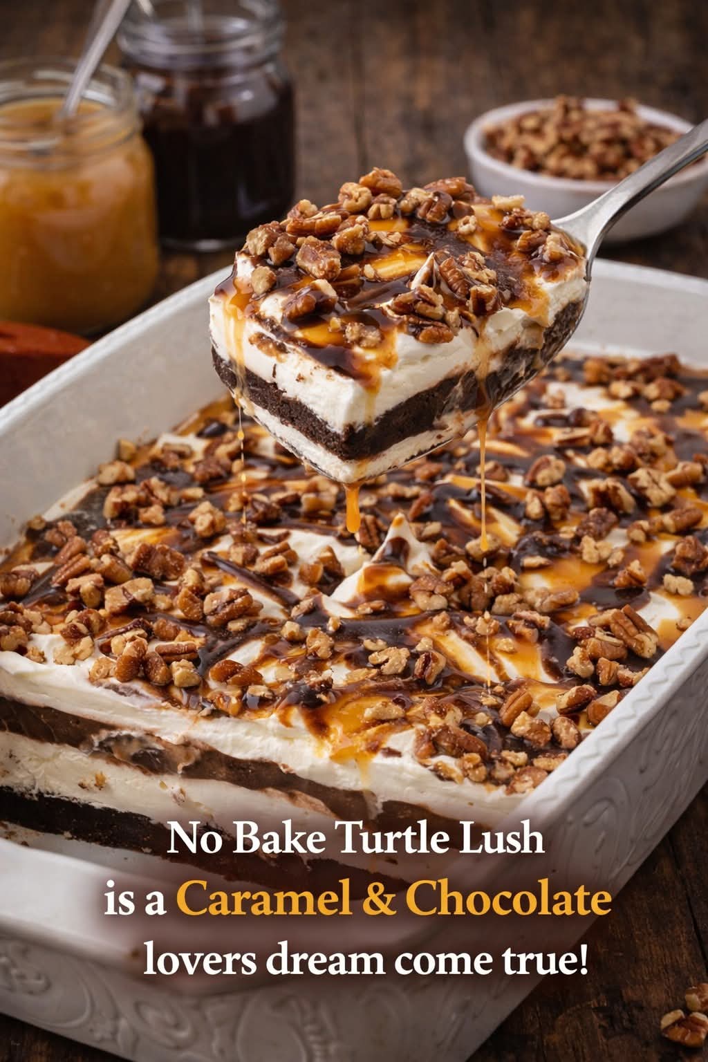 No-Bake Turtle Lush: The Ultimate Caramel, Chocolate, and Pecan Layered Dream Dessert