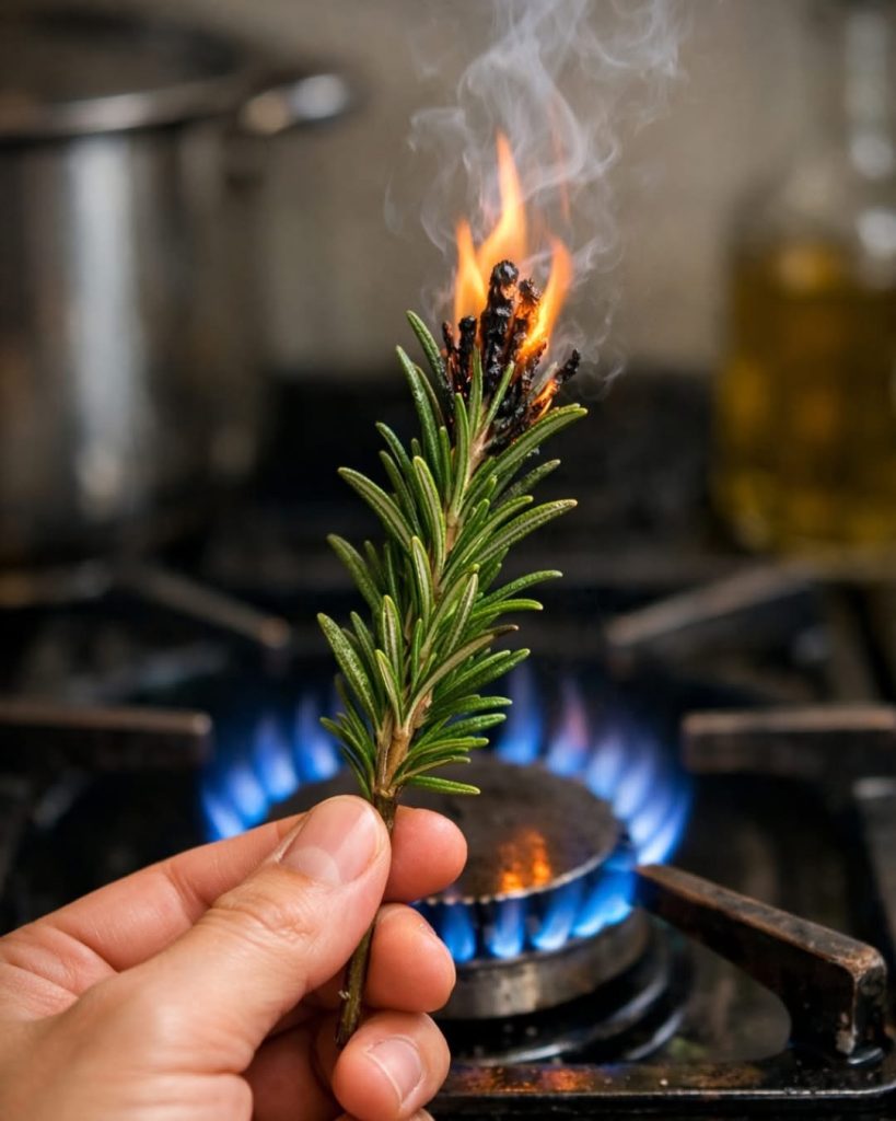 Burnt rosemary is created by briefly holding a fresh sprig of rosemary over a gas flame or open heat until the tip ignites and lightly chars. The leaves release their natural essential oils, producing a warm, piney smoke that instantly fills the kitchen with an irresistible aroma.