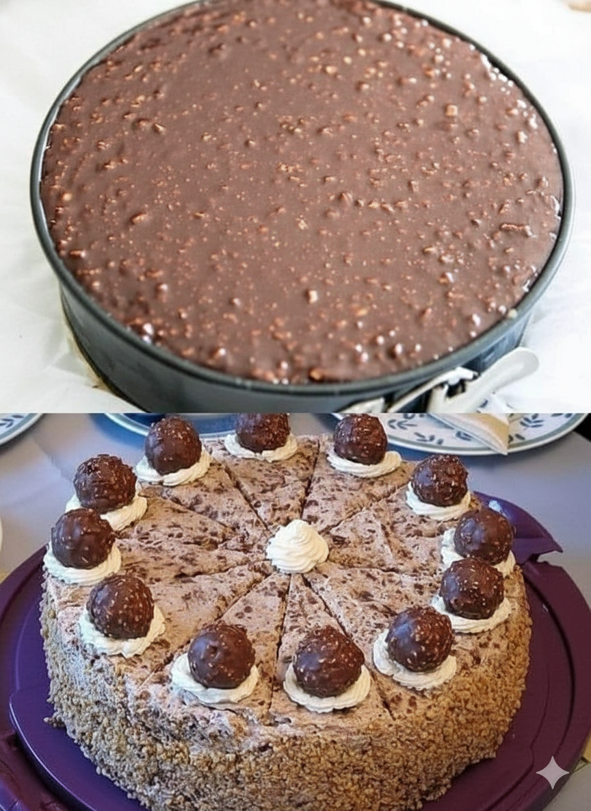 Those iconic golden-wrapped hazelnut truffles that we all secretly eat one after another straight from the box… now imagine them transformed into a towering, creamy, crunchy, ultra-chocolatey cake that looks like it came straight from a high-end patisserie.