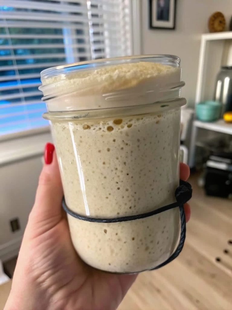 The rubber band around the jar is often used as a marker to track how much the starter has risen—an excellent habit for bakers.