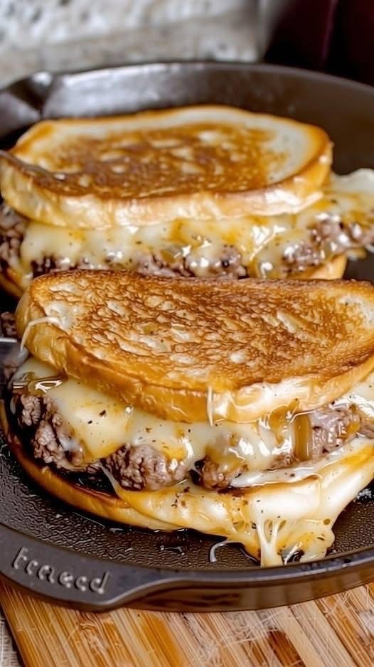 Crispy golden bread juicy beef patties and rich melted cheese all together in a comforting hearty sandwich perfect for lunch or dinner