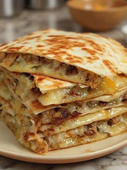 This towering quesadilla stack is all about layers of seasoned beef, stretchy cheese, and golden tortillas—crispy outside, gooey inside. Perfect for family dinner, parties, or when you want comfort food that hits.