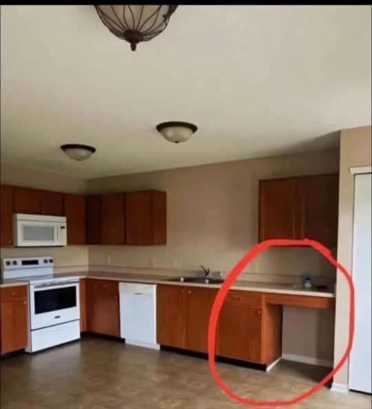 The empty section shown is located under the countertop, next to cabinets and appliances. It has: