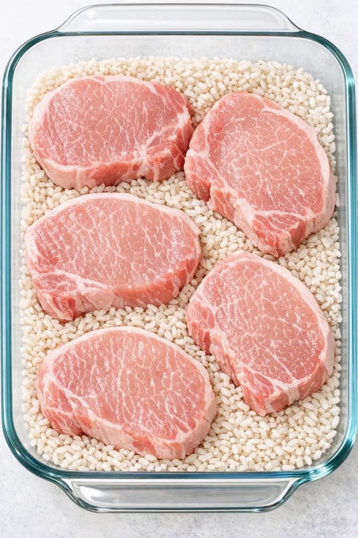 Place the seared pork chops on top of the rice mixture. Cover the dish tightly with aluminum foil.