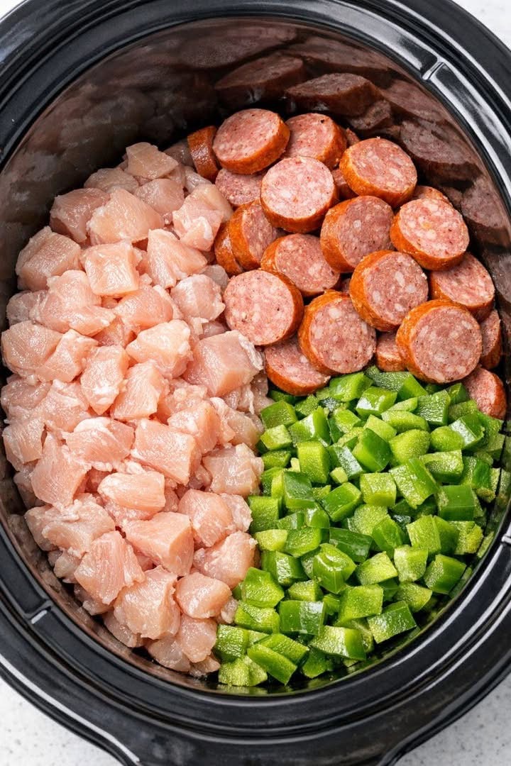 For a slightly more traditional Louisiana flavor profile, you can swap the Italian seasoning for a Cajun or Creole seasoning blend, but keep the total to three main seasonings to honor the spirit of the recipe: for instance, use smoked paprika, Cajun seasoning, and seasoned salt as your trio. If you prefer dark meat, boneless, skinless chicken thighs work beautifully and stay especially moist during slow cooking. To reduce the heat, skip the cayenne and choose a milder smoked sausage like kielbasa; to increase it, use andouille sausage and add extra cayenne or a splash of hot sauce at the end. Brown rice can be used, but you’ll need to increase the broth by about 1/2 cup and extend the cooking time; be aware that the texture will be heartier and the grains less fluffy. For a more vegetable-forward version, stir in a handful of frozen okra or peas during the last 30 minutes of cooking. If you need to make this ahead, you can dice the chicken and vegetables and slice the sausage the night before, then simply dump everything into the slow cooker in the morning. Leftovers reheat well with a splash of extra broth or water to loosen the rice, and they often taste even better the next day as the flavors continue to mingle.