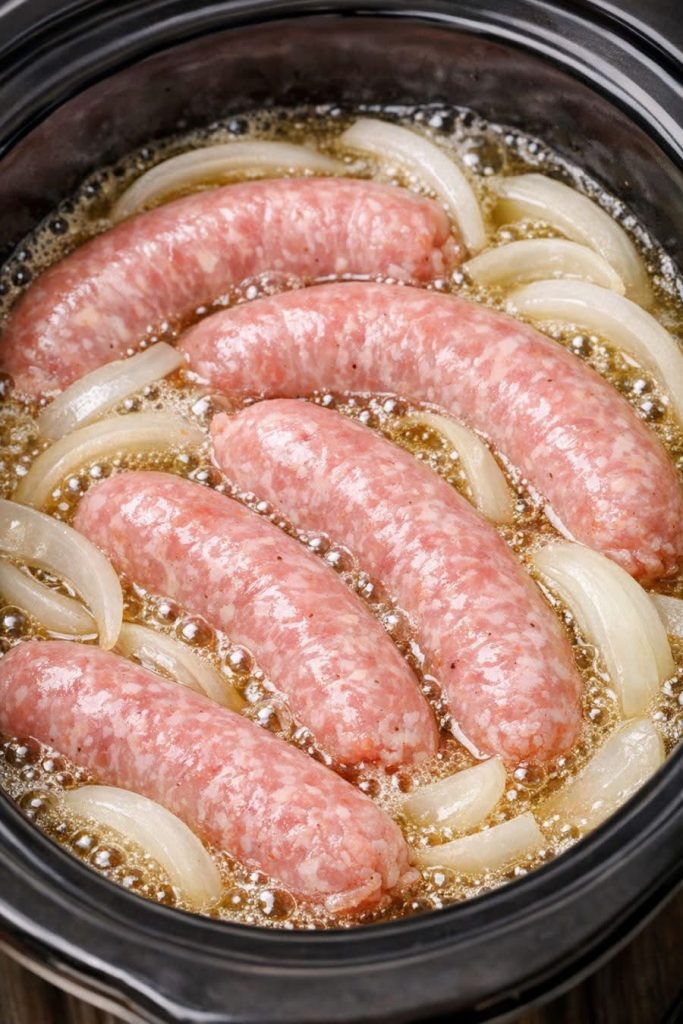 Cover and cook on low for 6 to 8 hours or on high for 3 to 4 hours, until the sausages are fully cooked and tender and the onions are soft and caramelized.