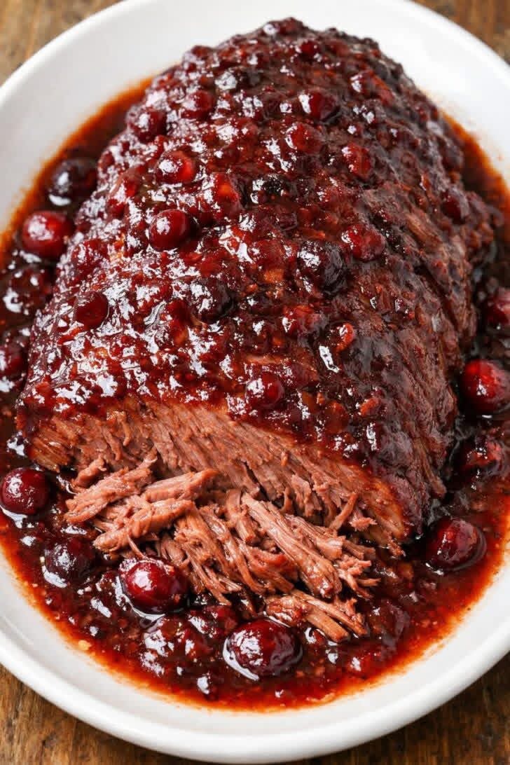 This tender beef roast is slow-cooked and covered in a rich cranberry balsamic glaze that is sweet, tangy, and savory. The cranberries create a beautiful sauce that pairs perfectly with the juicy beef, making this dish perfect for holidays or comforting family dinners.