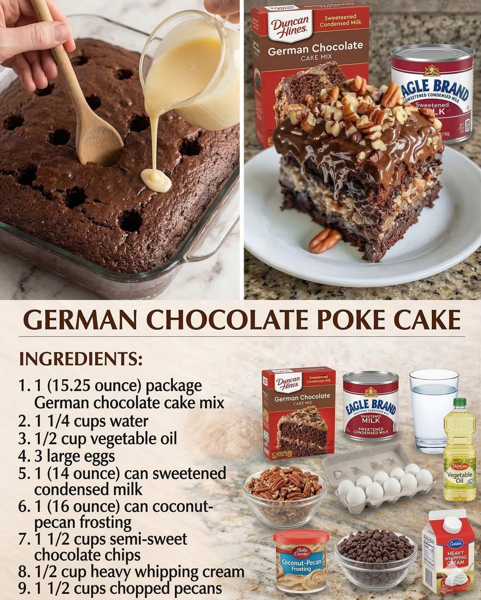 German Chocolate Poke Cake is a delicious dessert that is simple to prepare yet full of flavor. With its moist chocolate base, sweet caramel filling, and coconut-pecan topping, it is guaranteed to impress family and friends. Serve it chilled and enjoy every rich, creamy bite.
