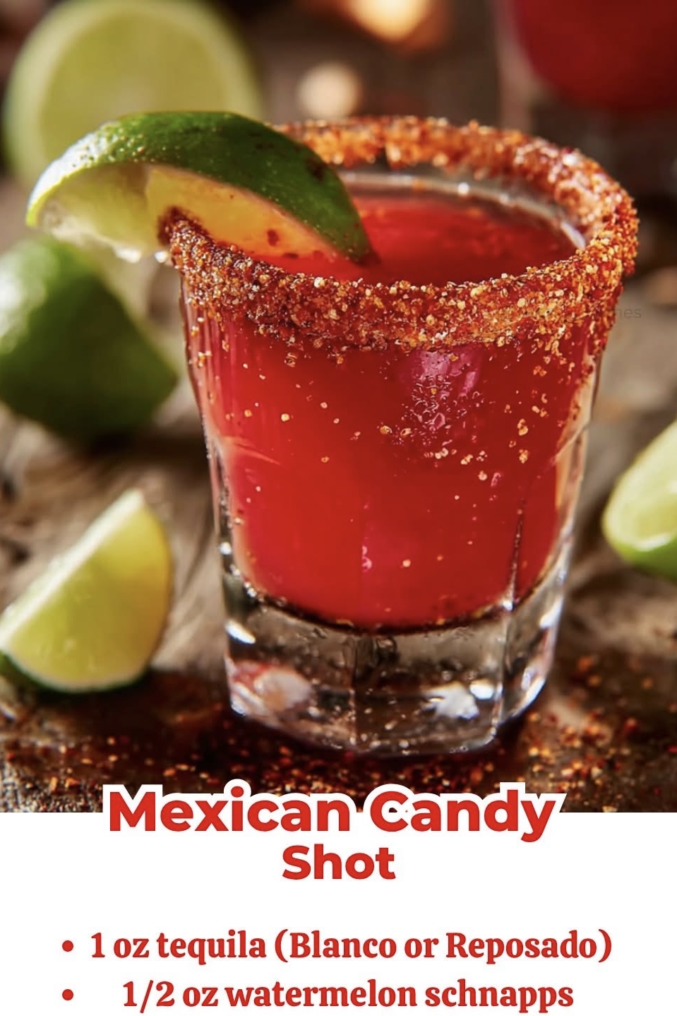 A fun and flavorful shot inspired by Mexican candy, combining sweet, tangy, and spicy notes with a refreshing citrus kick. Perfect for parties or a bold treat.