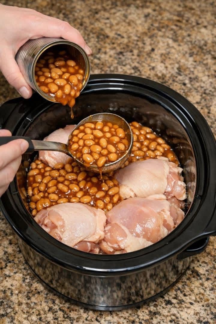 This is one of those super easy “dump and go” meals that turns simple ingredients into a rich, comforting dish. Juicy chicken cooks slowly in sweet and savory baked beans, creating a hearty meal with almost no effort.
