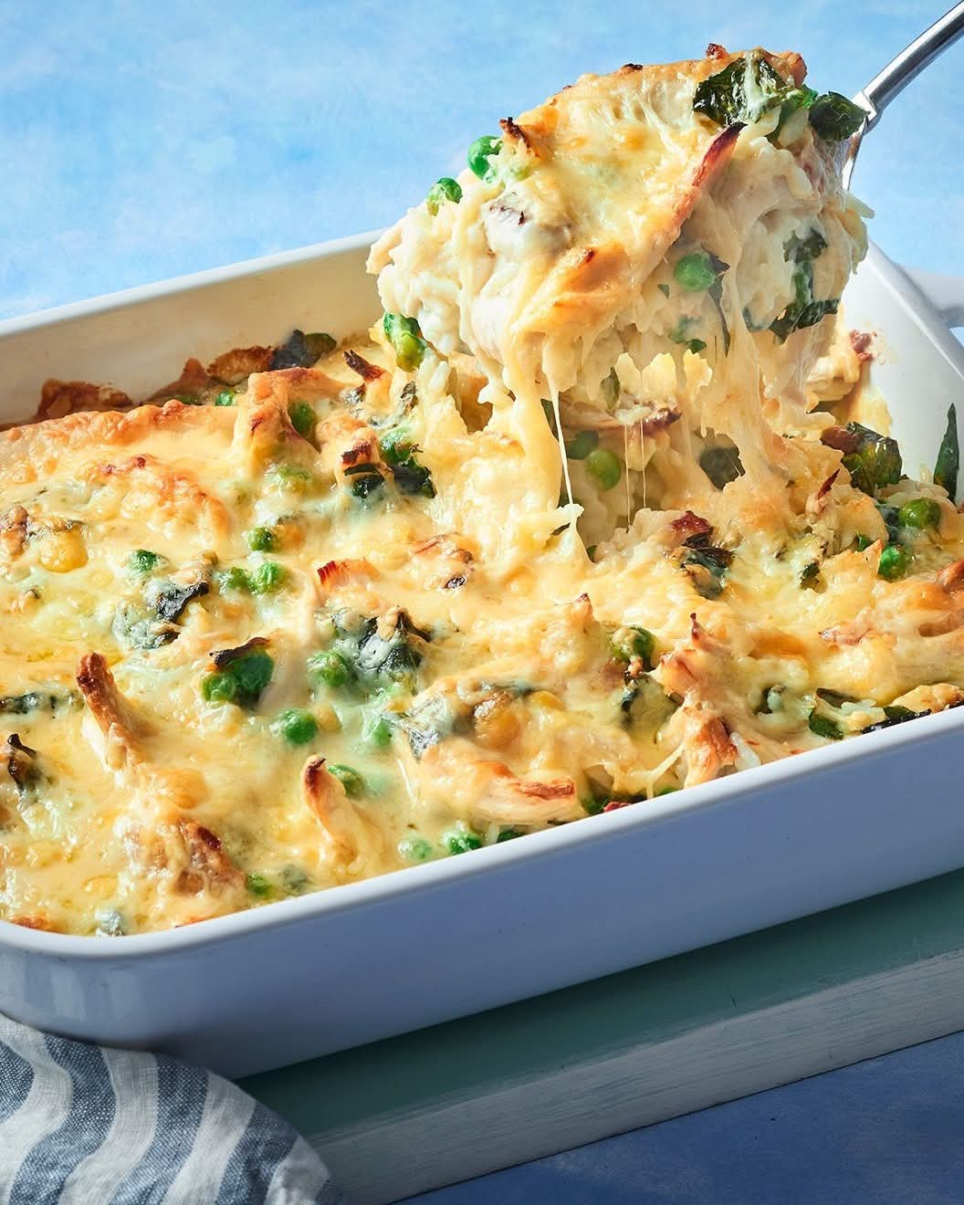 Today’s versions, like this creamy chicken, pea & spinach casserole, focus on fresh ingredients and balanced flavors while retaining that nostalgic, cozy appeal. It represents the best of home cooking — simple techniques, maximum flavor, and the ability to feed a crowd without stress.