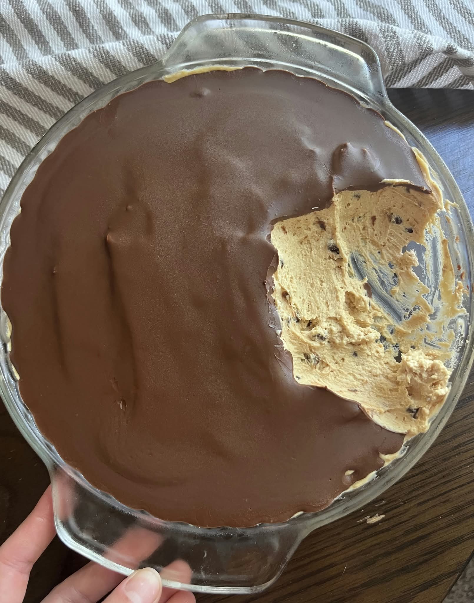 Spread the mixture into your pie dish. Use an offset spatula to level the top. It needs to be perfectly flat so the ganache shell sits evenly. Refrigerate for at least 2 hours before adding the chocolate layer. If the pie isn’t cold, the warm ganache will melt the mousse, creating a muddy swirl instead of a clean layer.