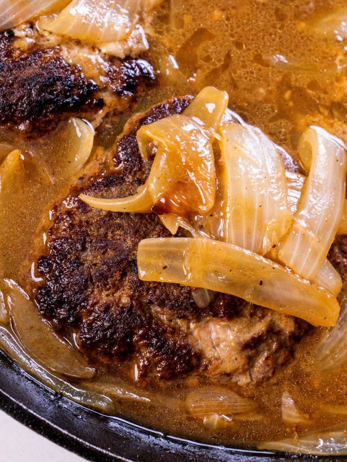 Place the seared patties back into the skillet, nestled into the onions and gravy. Cover the pan and reduce heat to low. Simmer for 10–15 minutes. This allows the meat to finish cooking while absorbing the flavors of the gravy.